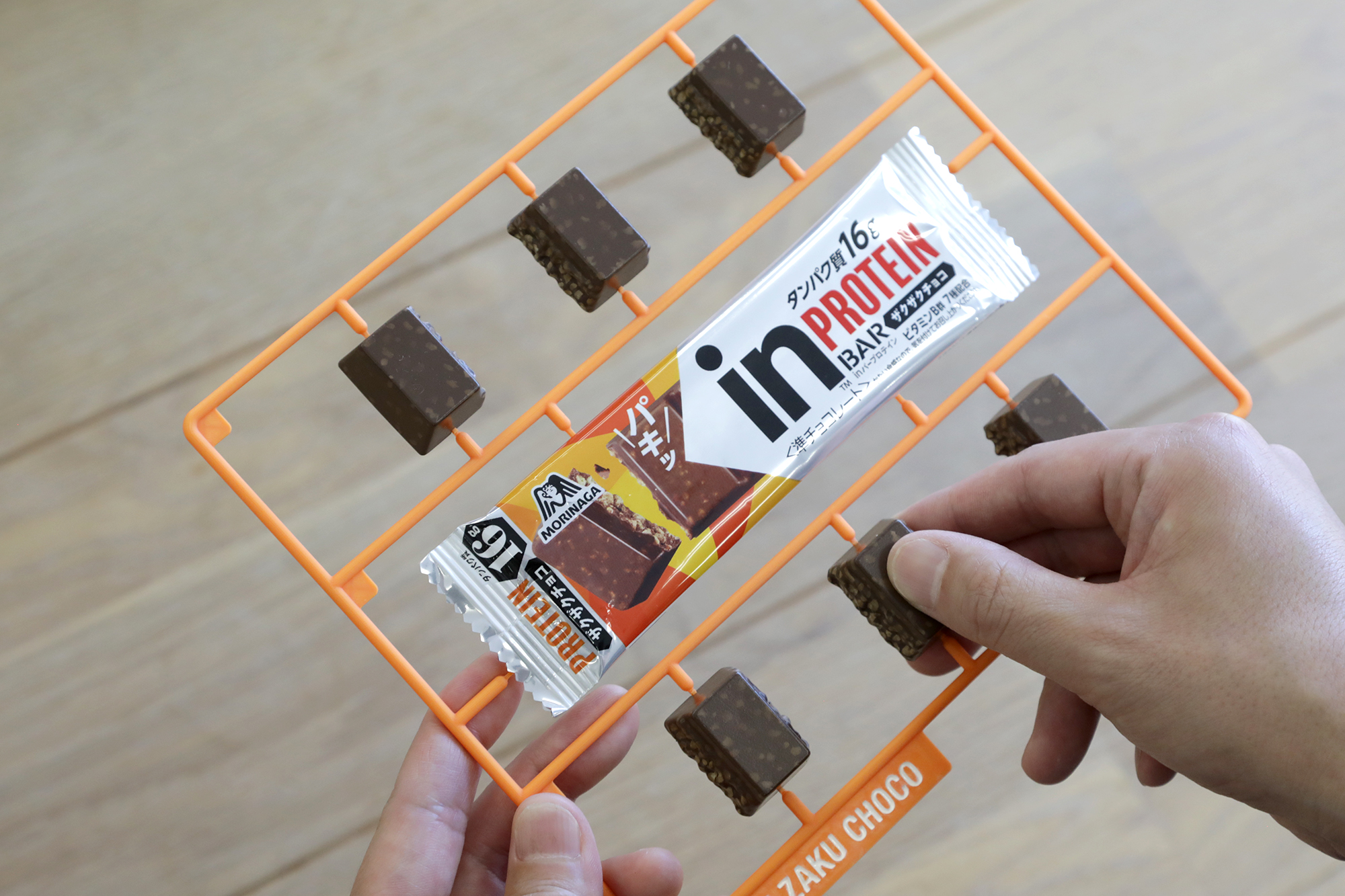 森永製菓商品「inバープロテイン ザクザクチョコ・ザクザクビター」のCMに登場するプラモデル風inバーの小道具をゼペットが制作しました。